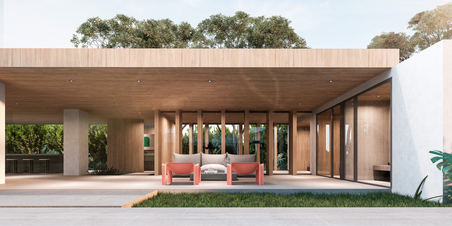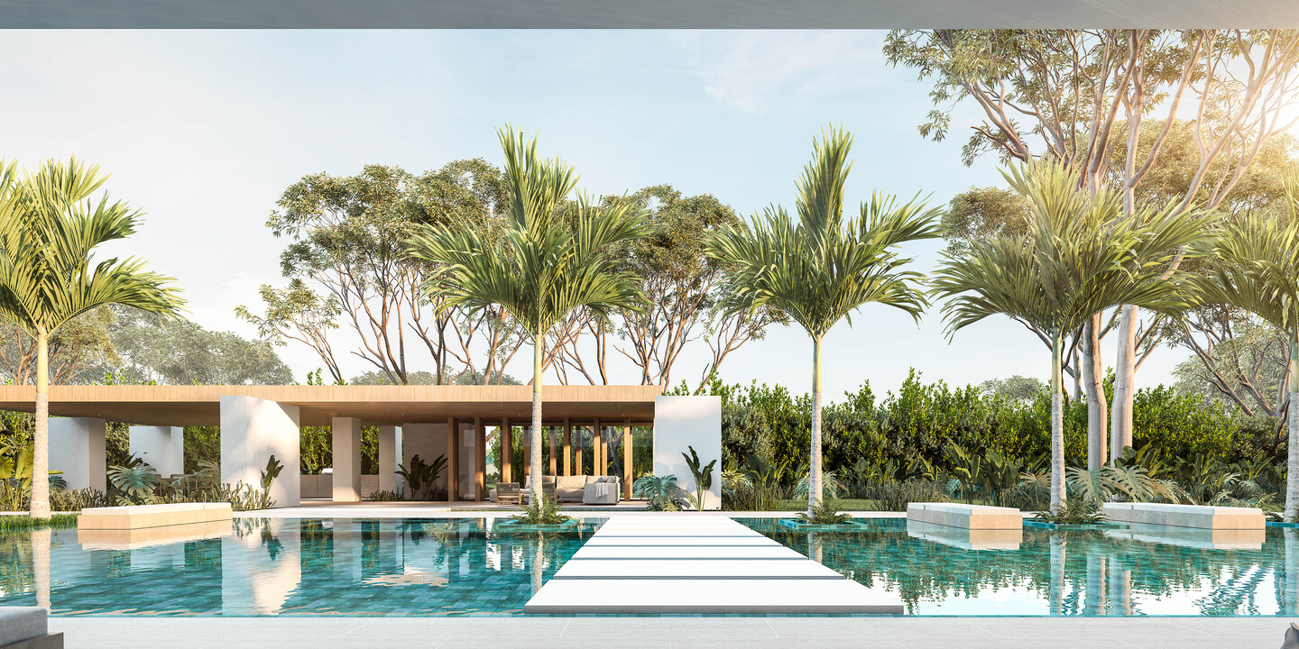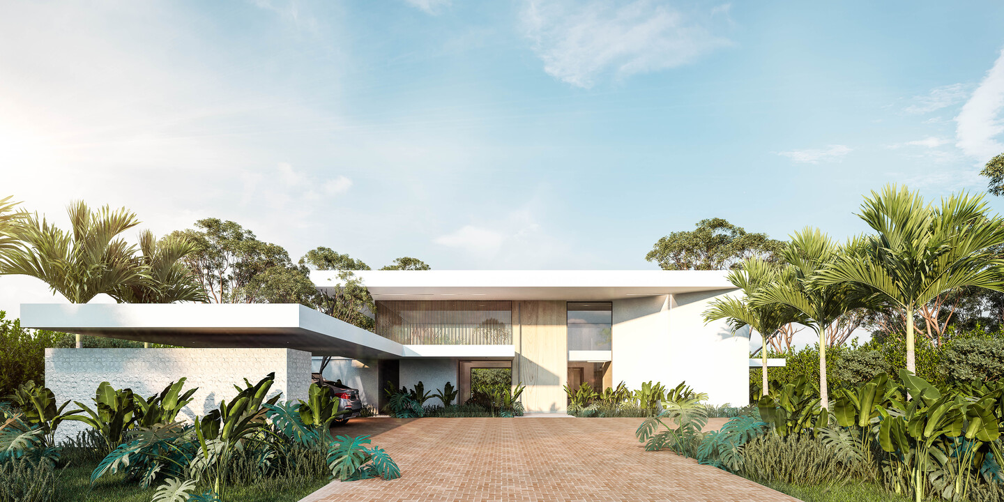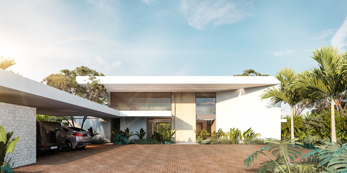 Este proyecto residencial se desarrolla bajo un lenguaje minimalista y contemporáneo, implantado en un entorno tropical que enmarca la arquitectura con vegetación abundante y atmósfera cálida.