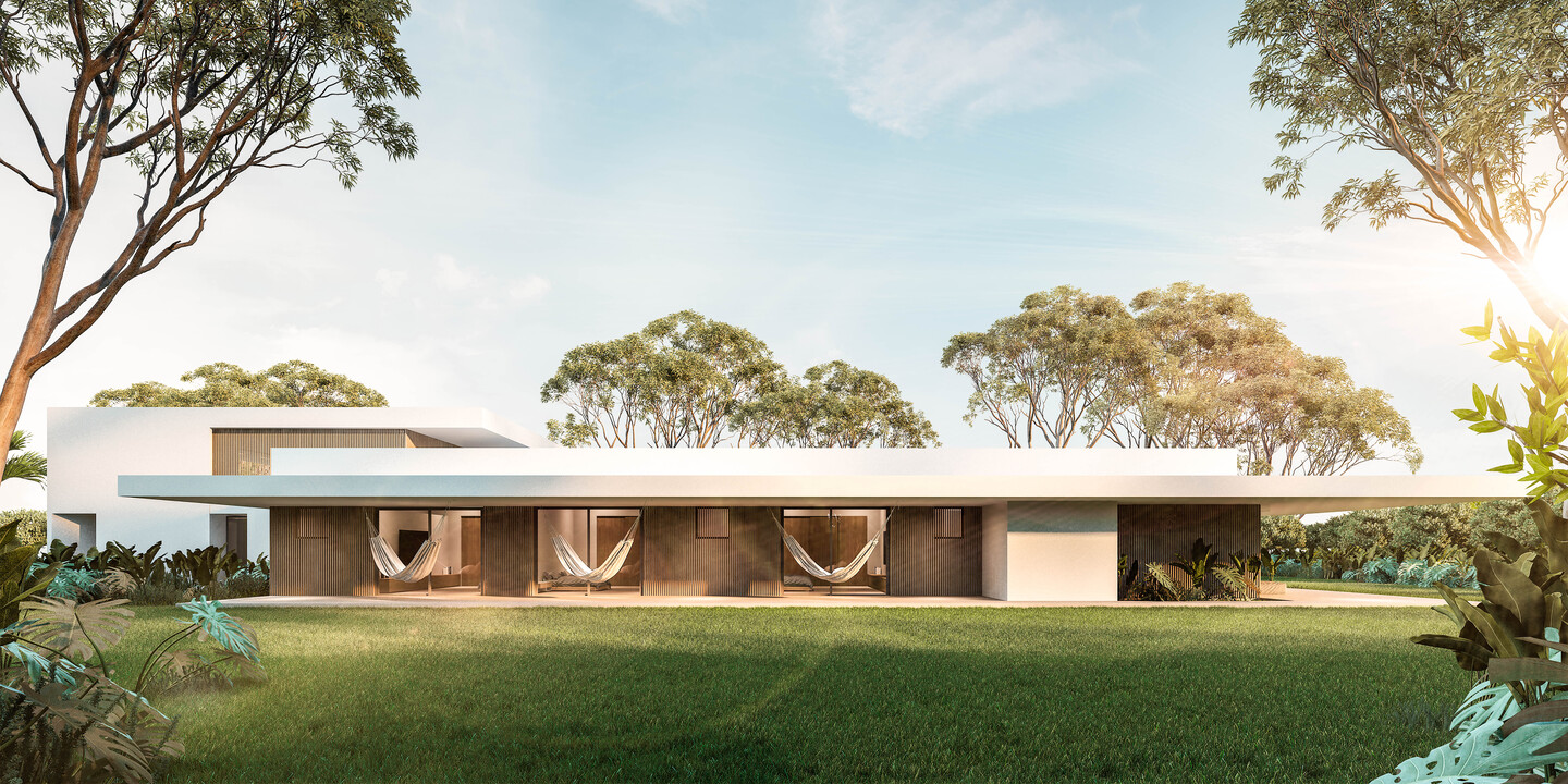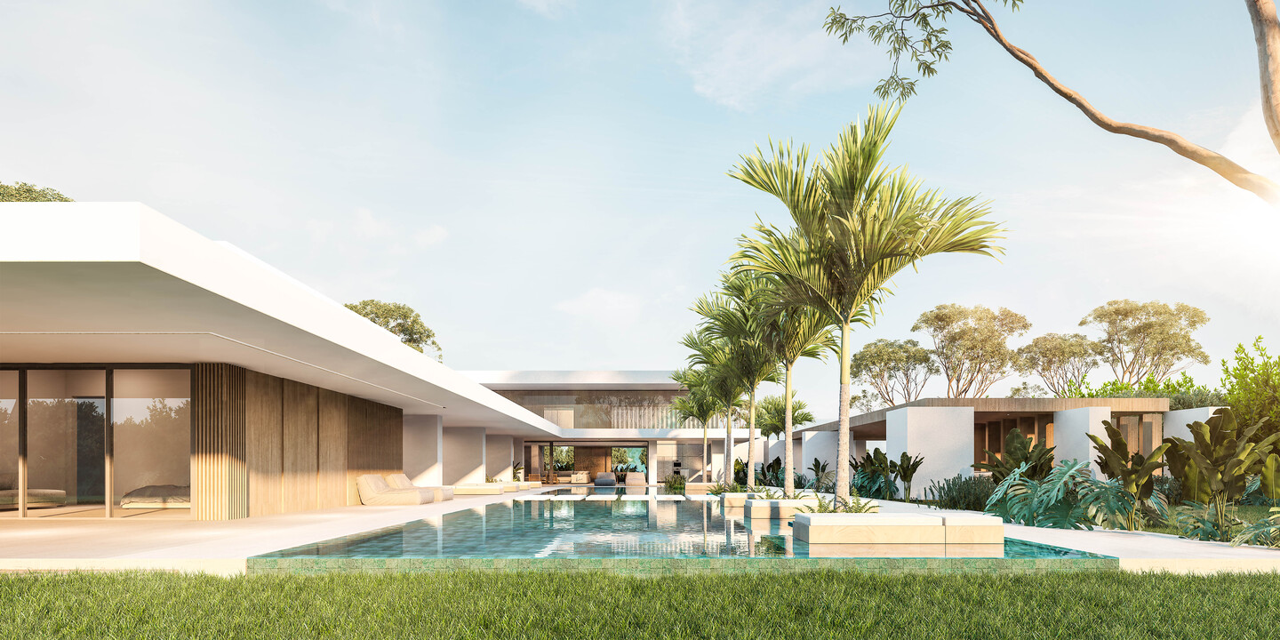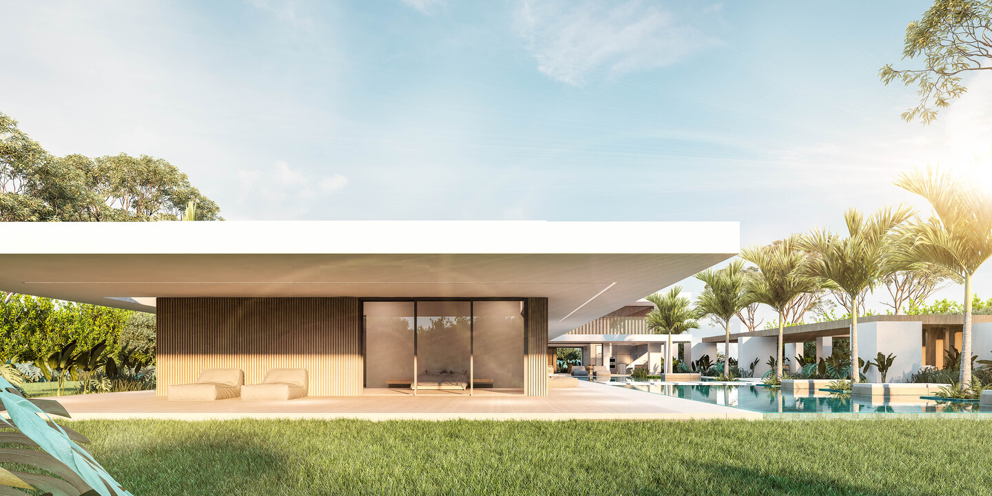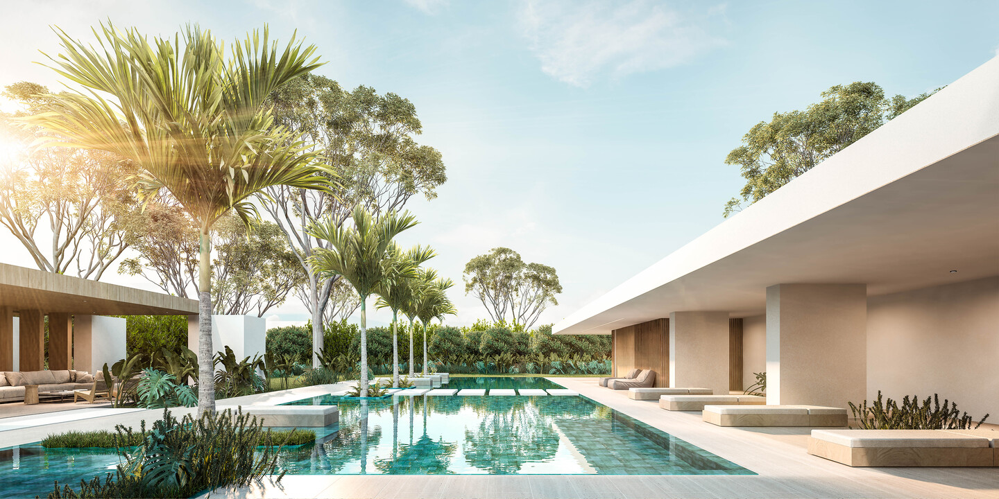 Este proyecto residencial se desarrolla bajo un lenguaje minimalista y contemporáneo, implantado en un entorno tropical que enmarca la arquitectura con vegetación abundante y atmósfera cálida.