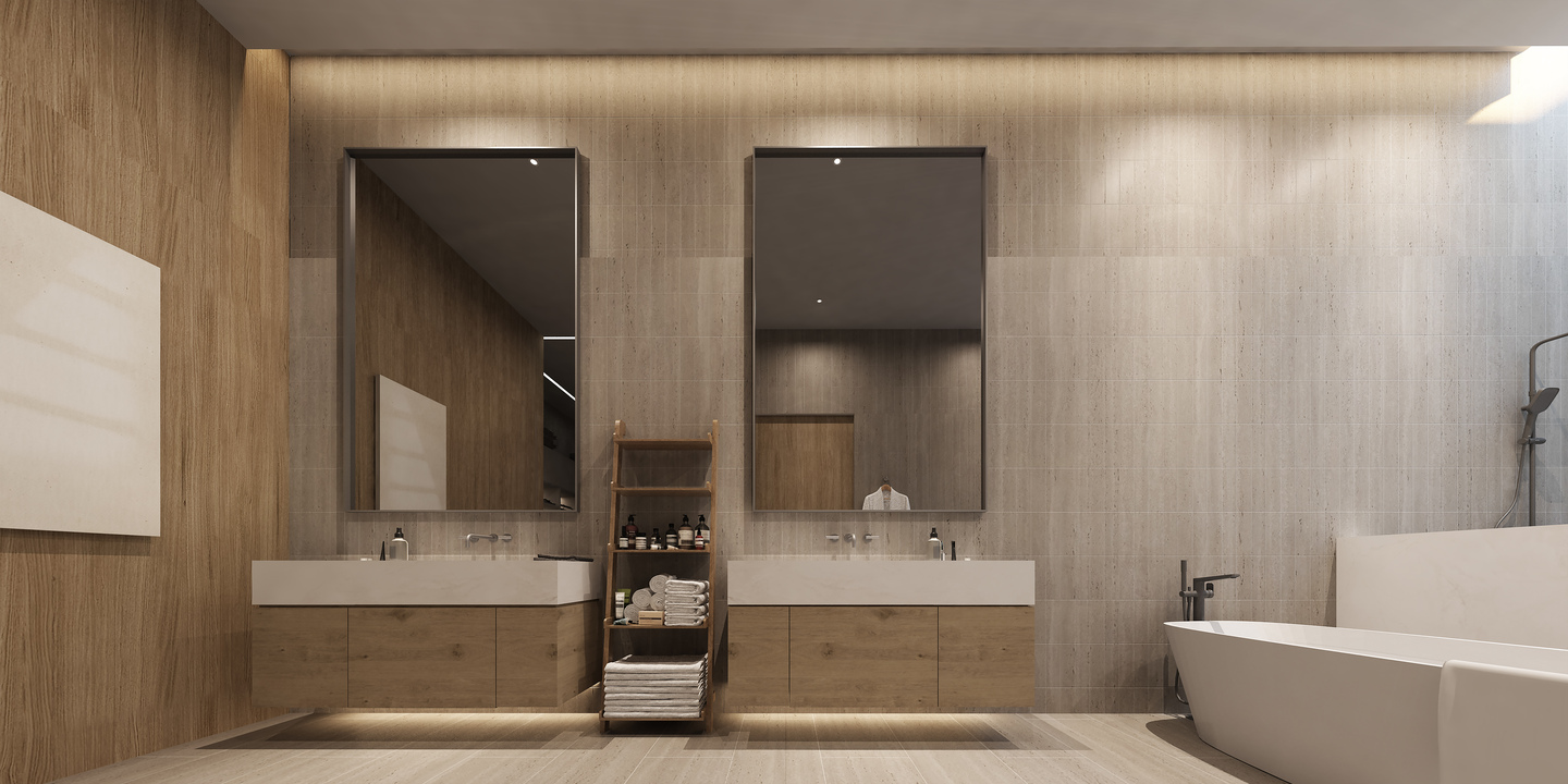 El diseño privilegia las líneas horizontales y la pureza volumétrica, destacando el contraste entre superficies blancas y texturas naturales en madera y piedra. La composición arquitectónica se abre hacia el paisaje mediante amplios ventanales y espacios fluidos, logrando una conexión directa entre interior y exterior.