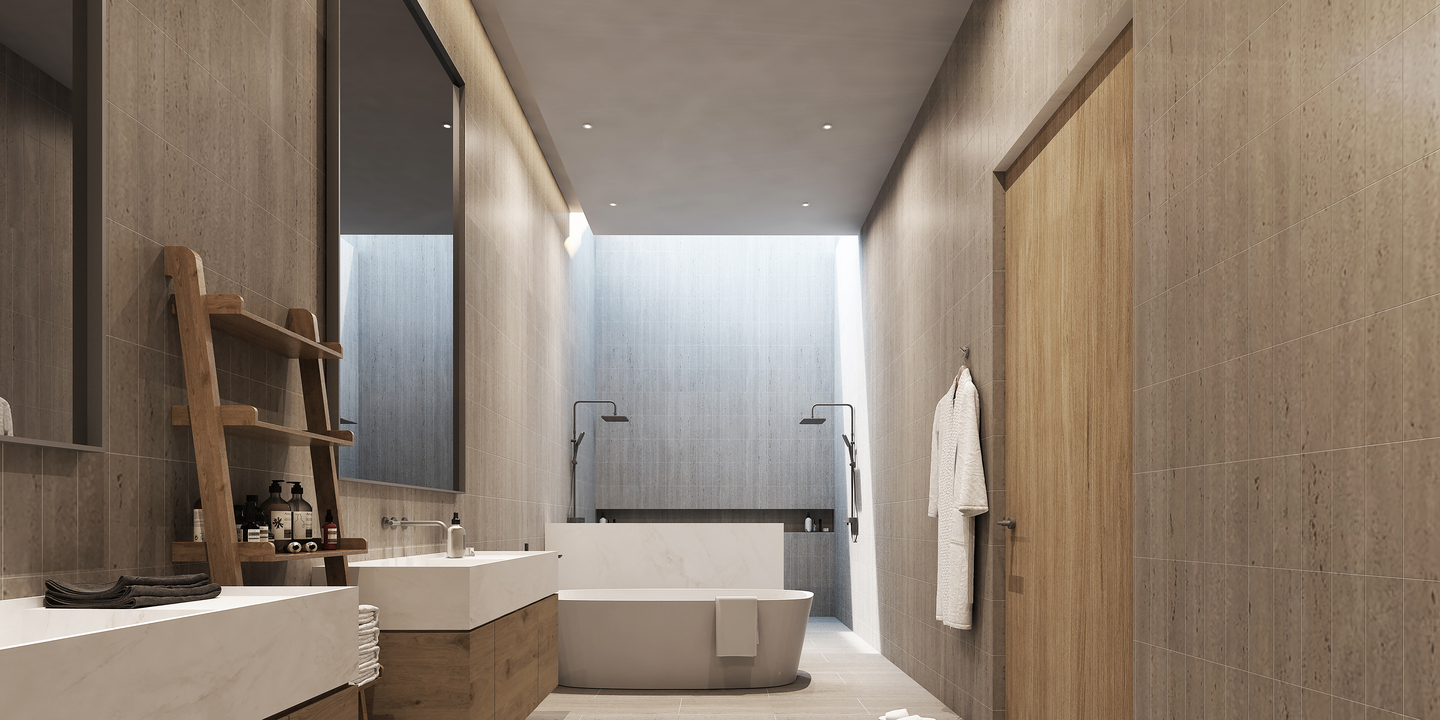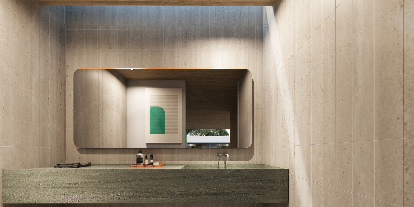 El área social se articula en torno a un gran espejo de agua y piscina central, que no solo funciona como eje visual, sino también como regulador climático, refrescando el ambiente y generando reflejos que enriquecen la percepción espacial. El recorrido hacia las zonas comunes se plantea a través de pasarelas y plataformas ligeras que atraviesan el agua, reforzando la experiencia de habitar el paisaje.