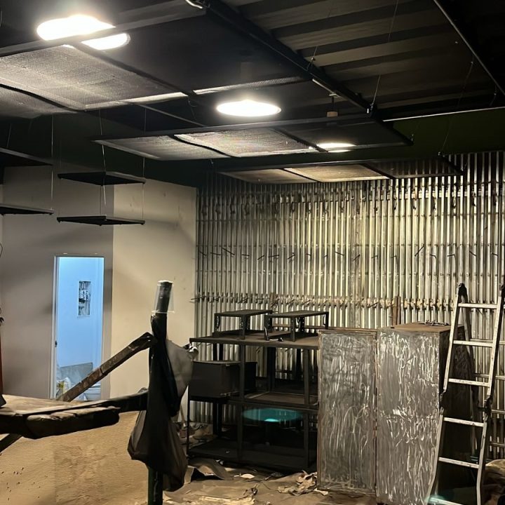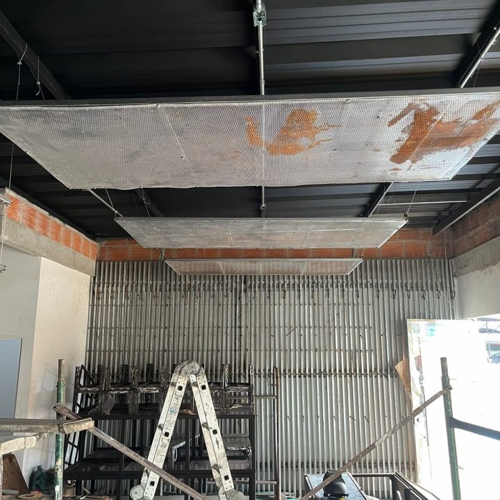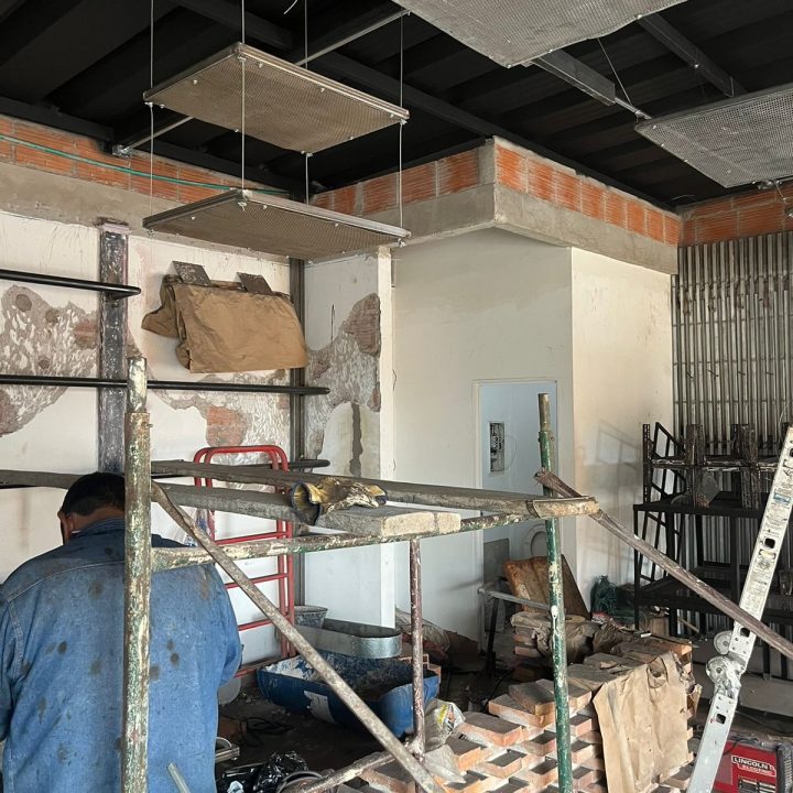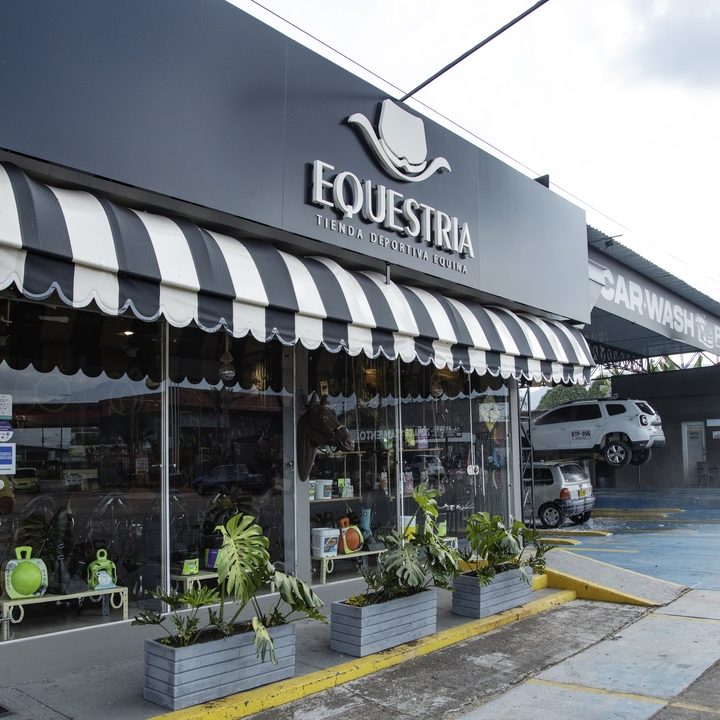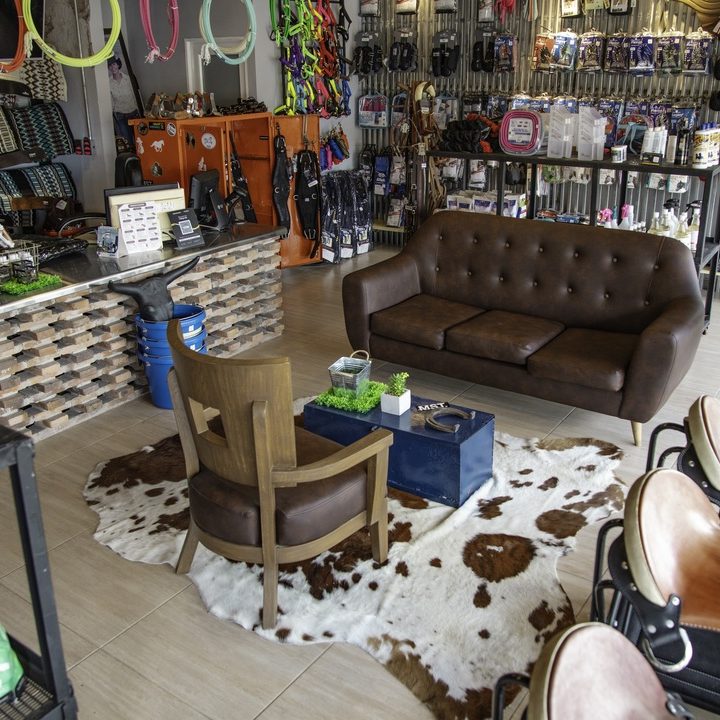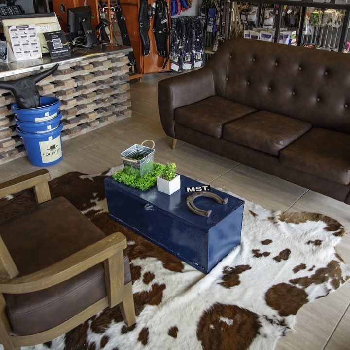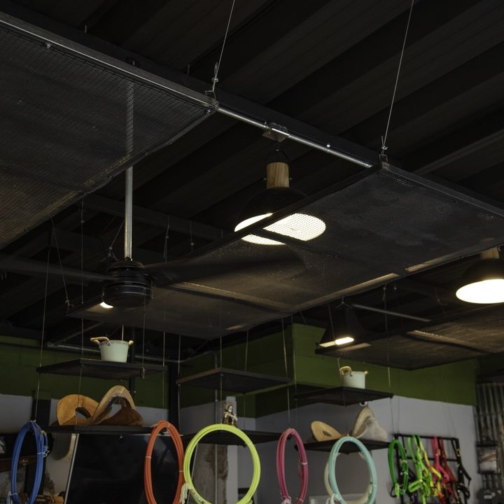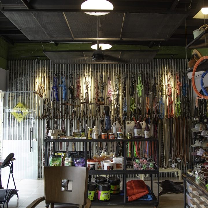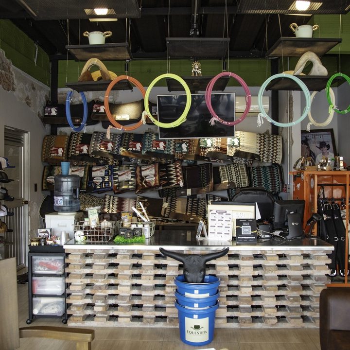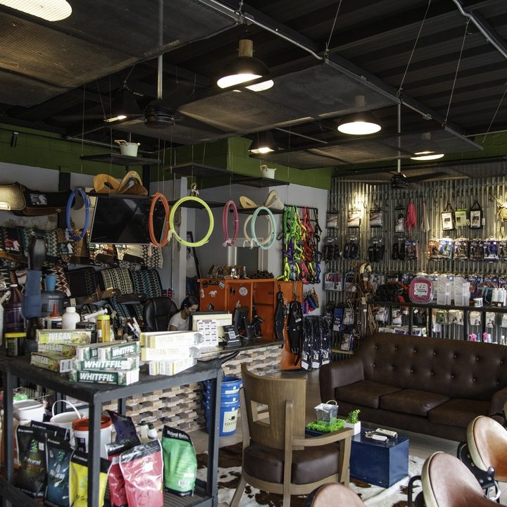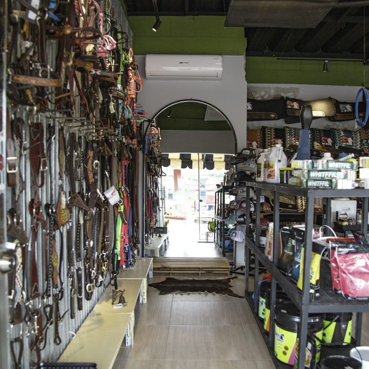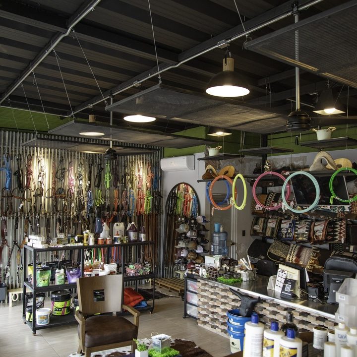 La atmósfera interior combina lo rústico e industrial: techos altos, estructuras metálicas expuestas, pisos en concreto pulido y detalles en madera natural, todo articulado con una iluminación cálida que resalta texturas y volúmenes. Los espacios fueron organizados para albergar áreas de venta de implementos ecuestres, accesorios ganaderos y zonas de reunión, integrando funcionalidad y carácter temático en un mismo lugar.