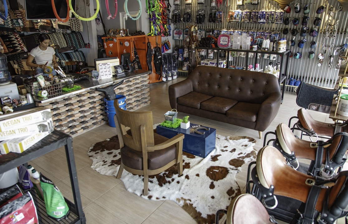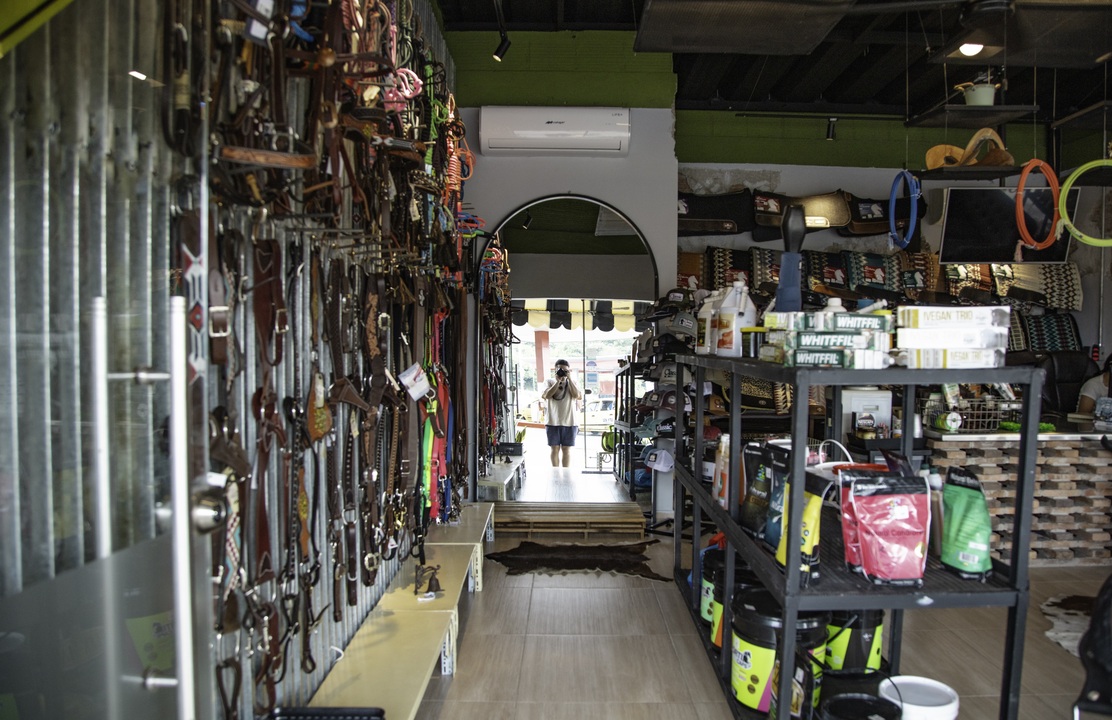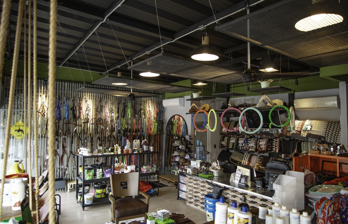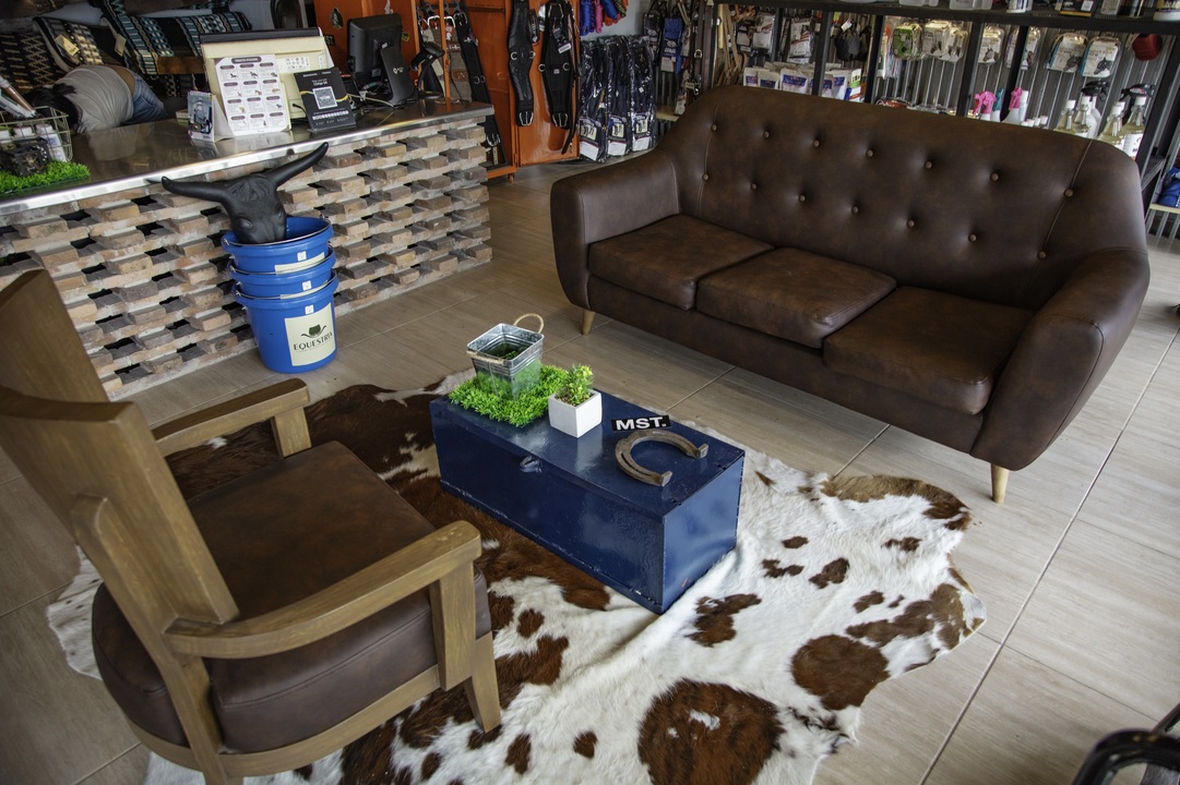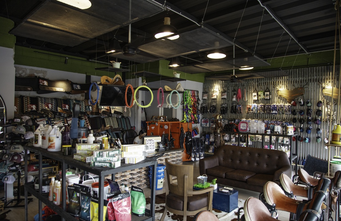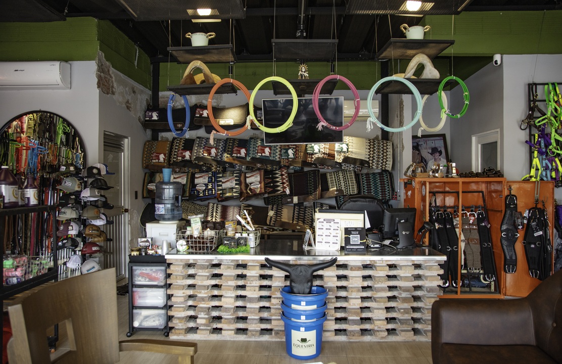 La atmósfera interior combina lo rústico e industrial: techos altos, estructuras metálicas expuestas, pisos en concreto pulido y detalles en madera natural, todo articulado con una iluminación cálida que resalta texturas y volúmenes. Los espacios fueron organizados para albergar áreas de venta de implementos ecuestres, accesorios ganaderos y zonas de reunión, integrando funcionalidad y carácter temático en un mismo lugar.
