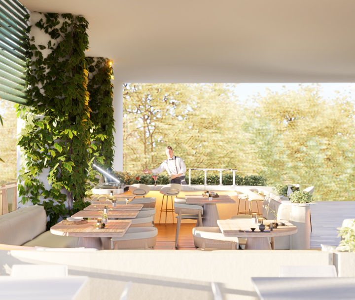 La propuesta de interiorismo se estructura a partir de un gran espacio abierto, donde los recorridos fluyen entre áreas de tapeo, mesas altas y lounge, rematando en una barra protagonista que funciona tanto como punto de servicio como escenario para el DJ. La mezcla entre madera orgánica, piedra natural y mobiliario de líneas …
